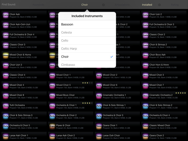 Sound FinderiSymphonic Orchestra provides a large amount of sounds. You easy and quickly find any sound you need though by using the app's interactive filter options. The list of sounds updates in real-time while you are typing your search keywords or while selecting filter options from the popup menus. Filter options which are already ruled out by your current search criteria are automatically grayed out. You can also rate the individual sounds with 1 to 5 stars and then easily find your favorite sounds by using the sound rating filter. Player / RecorderiSymphonic Orchestra comes with a built-in multi-part and multi-track MIDI player and recorder, which you can use for easy and quick recording your musical ideas without launching and configuring a separate app or external devices. Here is a summary of its features: